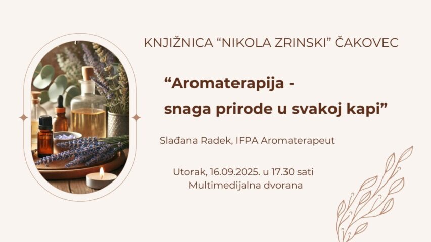 U utorak 16.09.2025. u 17:30 sati u Multimedijalnoj dvorani Knjižnice „Nikola Zrinski” Čakovec održat će se predavanje o aromaterapiji pod nazivom „Aromaterapija – snaga prirode u svakoj kapi“.