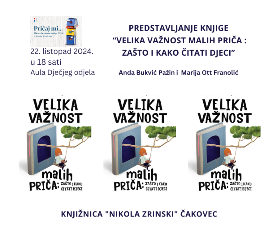 Poštovani, pozivamo Vas u utorak 22. 10. 2024. u 18 sati u Aulu Dječjeg odjela Knjižnice na predstavljanje knjige „Velika važnost malih priča : zašto i kako čitati djeci” autorica Ande Bukvić Pažin i Marije Ott Franolić. Velika važnost malih priča je popularnoznanstvena knjiga koja govori o čitanju djeci i s djecom. Objašnjava kako u današnje digitalno doba djecu motivirati i naučiti ih da uživaju u čitanju te kako im pomoći da obogate svoj rječnik i povećaju koncentraciju, ne samo za čitanje nego i za pamćenje i učenje. Ako ste roditelj, odgojitelj i odgojiteljica, učitelj i učiteljica ili knjižničar […]